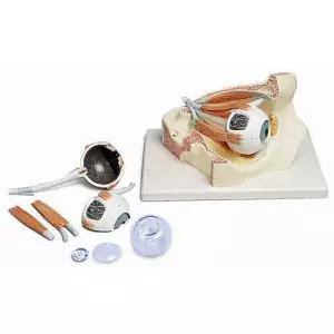 Das Modell zeigt den feingeweblichen Aufbau der Netzhaut mit Ader- und Lederhaut. Im linken blockförmigen, abgestuften Modellteil wird aus lichtmikroskopischer Sicht der gesamte Aufbau der Netzhaut mit der versorgenden Gefäßschicht und Anteilen der Lederhaut gezeigt. Das rechte Modellteil ist eine Ausschnittsvergrößerung. Sie zeigt den Feinbau der Photorezeptoren und der Pigmentepithelzellen. Linker Teil 850-fache Vergrößerung - rechter Teil 3800-fache Vergrößerung