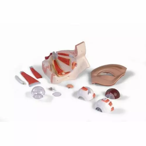 Dieses Modell zeigt den Augapfel mit Sehnerv in seiner natürlichen Lage in der knöchernen Augenhöhle (Boden und mediale Wand). Weiterhin verdeutlichen die umgebenden Strukturen die Beziehung zwischen Auge, Knochen, Muskeln und äußeren Strukturen des Auges. Zerlegbar in: * Zwei Hälften der Lederhaut * Sehnerv * M. rectus superior * M. rectus lateralis * Hornhaut * Linse * Tränendrüse * Glaskörper * Umgebende Strukturen * Augenhöhle