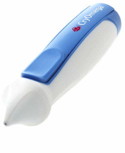 3. Halten Sie das Gerät aufrecht CryOmegala, orientévers nach unten, und die Positionierung der Düse über pulvérisationdirectement Läsion distancede eine 1 cm. Drücken Sie dann den Aktor und pulvériserle Kältemittel direkt an der Läsion mit undéplacement beschreibt einen kleinen Kreis durantla Spray behandelt, um den Bereich zu decken.