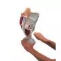 Stark vergrößertes Modell des menschlichen Kehlkopfs mit Zungenbein. Auf der rechten Hälfte sind die knorpeligen Strukturen dargestellt; die linke Hälfte zeigt die Muskulatur.