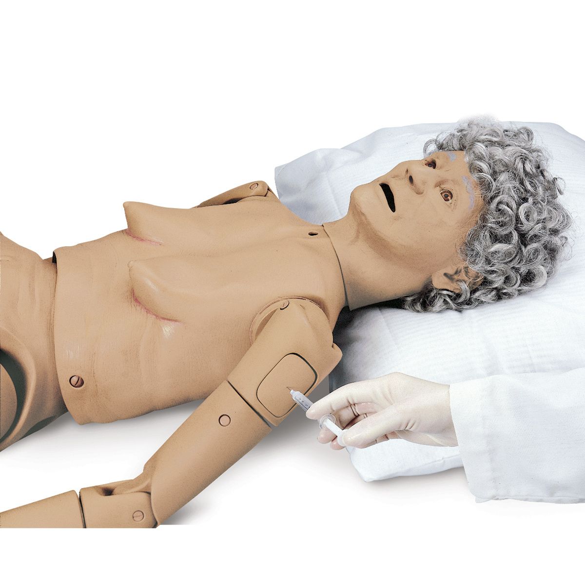 Diese Krankenpflegepuppe besitzt das Aussehen eines alten Menschen und kann zwischen männlich und weiblich umgewandelt werden. Sie ist zum Üben einer Vielzahl grundlegender Pflegemaßnahmen geeignet. Dargestellt sind Hautrunzeln, eine gerötete Hautfalte, eine erweiterte Pupille, ein Dekubitusgeschwür (Stadium I) im Sakralbereich, ein normales Muttermal und ein kanzeröses Muttermal. Der Hals und alle wichtigen Gelenke lassen sich vollständig in jede beliebige natürliche Stellung bringen. Hände und Füße sind aus einem weichen, elastischen Material gefertigt, um noch realistischer zu erscheinen. Die folgenden Pflegemaßnahmen lassen sich üben: • Prostatauntersuchung (Stadium B) • Stomaversorgung (Ileostomie und Kolostomie: Waschen und Absaugen) • Tracheostomaversorgung (Waschen und Absaugen) • Legen von Nasen-Magen-Sonden • Mund- und Nasenspülung, künstliche Ernährung (Magensonde) und Absaugen • Einlauf verabreichen (weiblich) • Abstriche und Spülungen • Intramuskuläre Injektion (Arme, Oberschenkel, Gesäß) • Mundhygiene (entfernbare obere und untere Zahnprothese) • Augenspülung • Wäsche im Bett, Haarpflege (Waschen, Kämmen) • Techniken zur Patientenlagerung und –umlagerung, Kleidungswechsel • Ohrspülung und Einsetzen eines Hörgerätes • Bandagieren und Anlegen von Wundverbänden (auch an Fingern und Zehen) Lieferung im Transportkarton.