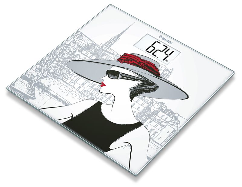 Glaswaage GS 209 Beauty Design-Glaswaage Mit detailverliebter Illustration Effektvolle weiße LCD-Beleuchtung Extra große LCD-Anzeige Trittfläche aus Sicherheitsglas
