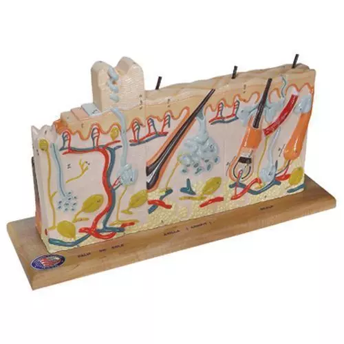 Sechs Modelle in einem! Die Vorderseite zeigt drei Reliefdarstellungen der gesunden Haut und ermöglicht den Vergleich von unbehaarter Haut, behaarter Körperhaut und Kopfhaut. Auf der Rückseite findet sich eine eindrucksvolle Darstellung der 3 klassischen Verbrennungsstadien. Man erkennt die Hautrötung als Zeichen der Verbrennung ersten Grades, die Blasenbildung und tiefere Schädigung im zweiten Stadium sowie das dritte Stadium mit kompletter, tiefer Zerstörung bis in die Unterhautschichten. 46 Merkmale sind nummeriert und im Beiblatt aufgeführt. Auf Grundbrett.
