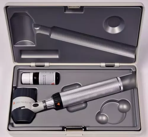 Dermatoskop mit Diodenbeleuchtung. Für die auflichtmikroskopische Untersuchung pigmentierter Hautveränderungen zur Früherkennung des malignen Melanoms. Die äußeren Hautschichten werden durch Benetzen mit Dermatoskopie-Öl durchsichtig gemacht.