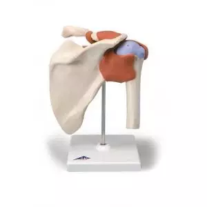 Dieses hochwertige Funktionsmodell eines rechten Gelenkes mit Bändern in natürlicher Größe zeigt die Anatomie und die physiologischen Bewegungsmöglichkeiten (z.B. Abduktionen, Anteversion, Retroversion, Außen- und Innenrotation) in außergewöhnlicher Detailtreue. Die Farbgebung der originalabgeformten Knochen ist äußerst realistisch. Der Knorpel an den Gelenkflächen ist blau dargestellt.