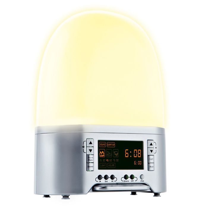Hier wird ab 30 Minuten vor dem Wecken das Licht sanft heraufgedimmt, und Sie können sich wahlweise mit 8 Naturklängen mit ansteigender Lautstärke oder per sanftem Weckton wecken lassen.