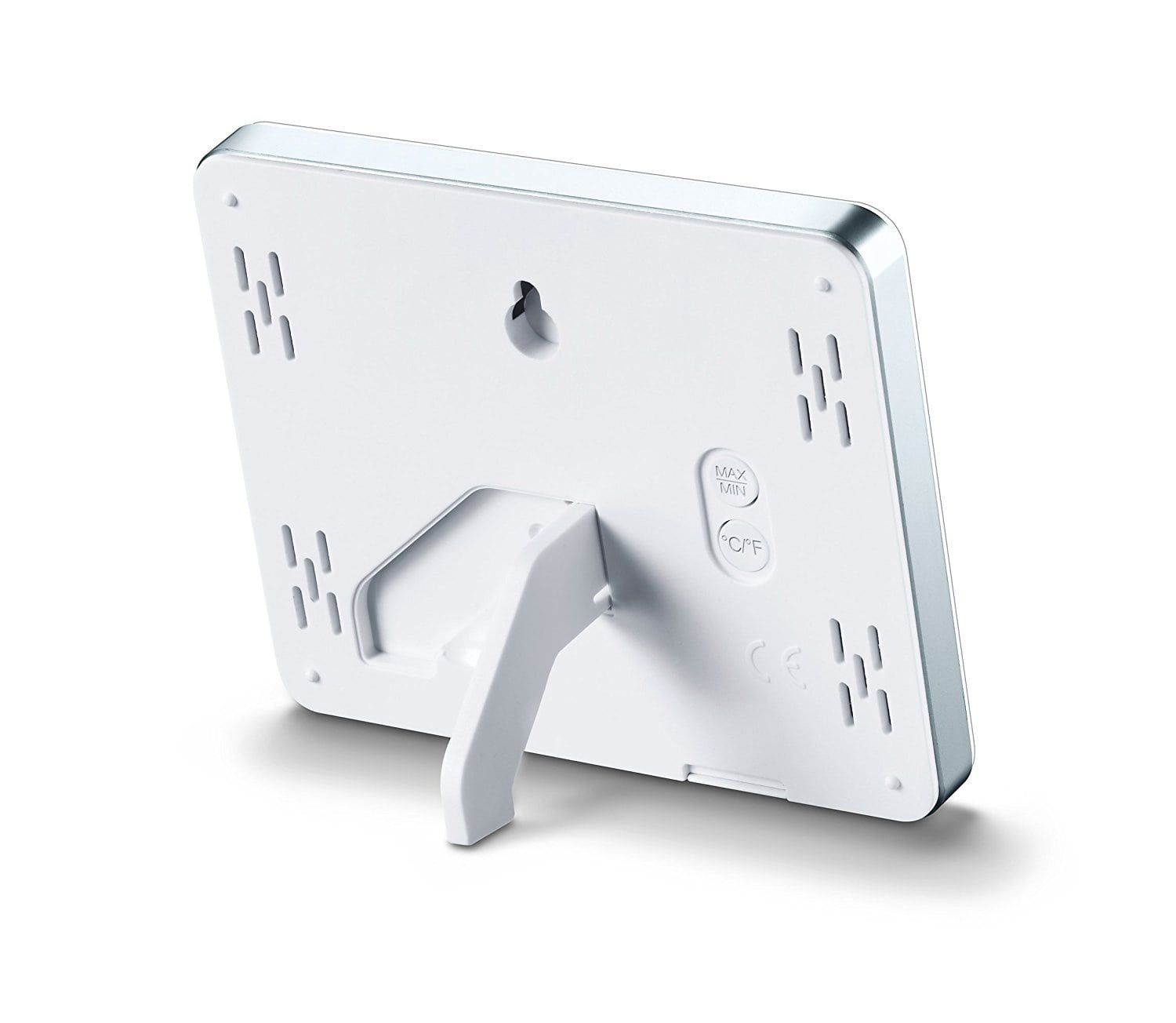Anzeige von Temperatur und Luftfeuchtigkeit Ideal zur Kontrolle des Raumklimas Messbereich Temperatur: 0 °C bis + 50 °C Messgenauigkeit: ± 0,1 °C Messbereich Luftfeuchtigkeit: 20 % bis 95 % Maximum- / Minimum-Anzeige der Temperatur und relativen Luftfeuchtigkeit Smiley-Anzeige: Lachendes Gesicht = 20 - 25 °C, 30 - 60 % Luftfeuchtigkeit (ideal) Neutrales Gesicht = beliebige Temperatur, < 30 % Luftfeuchtigkeit (trocken) Trauriges Gesicht = beliebige Temperatur, > 60 % Luftfeuchtigkeit (feucht) °C / °F umschaltbar Großes, einfach ablesbares Display Ausklappbarer Tischaufsteller und Aufhängemöglichkeit zur Wandmontage Inklusive 1 x CR2025 Batterie Produktmaße: 9,9 cm x 8,1 cm x 1,1 cm Produktgewicht: 70 g