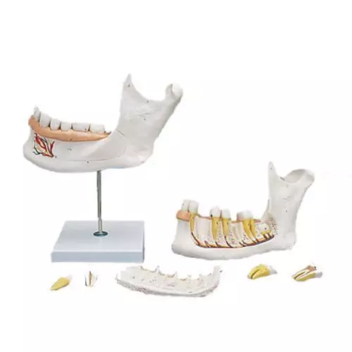 Dieses Modell zeigt die linke Unterkieferhälfte eines Jugendlichen. Zur Detailansicht der Zahnwurzeln, Spongiosa, Gefäße und Nerven ist eine Knochenpartie abnehmbar. Der Eckzahn und der erste Mahlzahn sind längs geschnitten und lassen sich für genauere Studien herausnehmen. Auf Stativ.