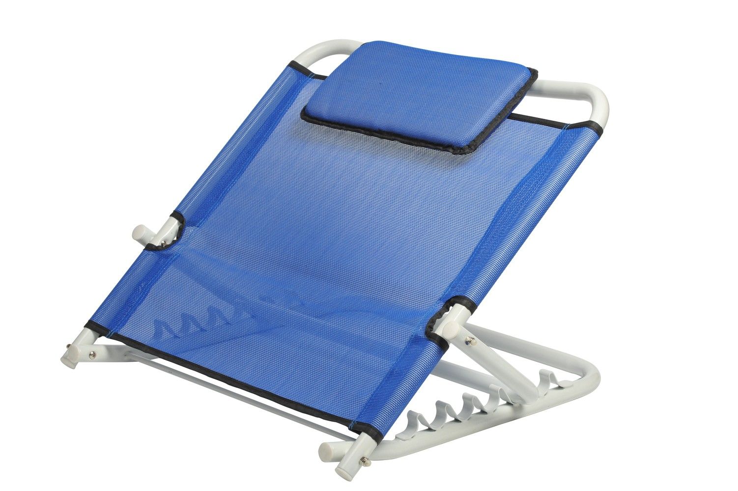 Die Rückenlehne können Sie bequem in einem Bett zu sitzen. Stahlrohrkonstruktion, mit weißem Epoxidharz bedeckt ist schwenkbar. Nylon-Beschichtung. Farbe: blau. Abmessungen: 61 x 51 x 35-45 cm.